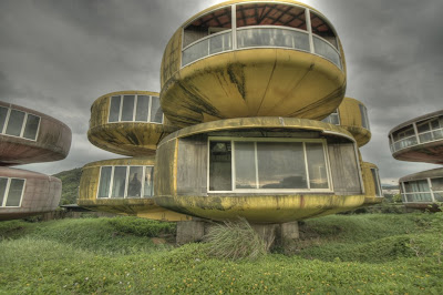 According to the photographer the whole resort was abandoned 20 years ago. Apparantly this future architecture was made partly from fibre glass and could not withstand the harsh coastal weather. There are also stories that the place was haunted after somebody had died in an accident.